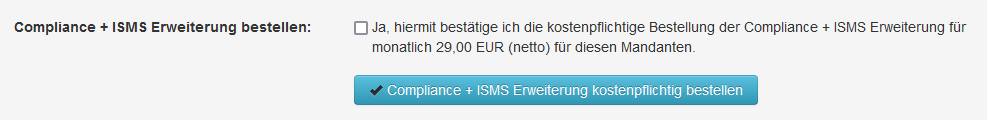 Der Systemadministrator eines Mandanten kann entweder in den „Rechnungs- und Lizenzdaten“ im Hauptmandanten über den Reiter „Umfang erweitern“ oder in den „Lizenzdaten“ eines Untermandanten die Bestellung des Compliance + ISMS Erweiterungs-Pakets durchführen: