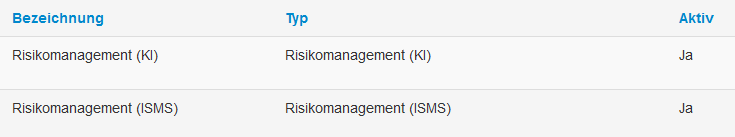 Es muss je eine Risikoeinstellung für ISMS und KI existieren und aktiviert sein, um in den neuen Modulen damit arbeiten zu können. Dies kann in den „Risikoeinstellungen“ erfolgen, in welcher die Einträge für beide Typen angelegt werden müssen: